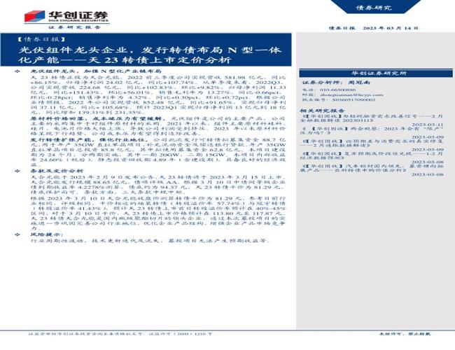 天23转债上市定价分析:光伏组件龙头企业,发行转债布局N型一体化产能