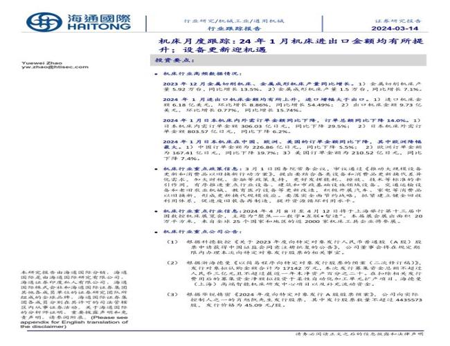 机床行业月度跟踪:24年1月机床进出口金额均有所提升,设备更新迎机遇-240314-海通国际-13页